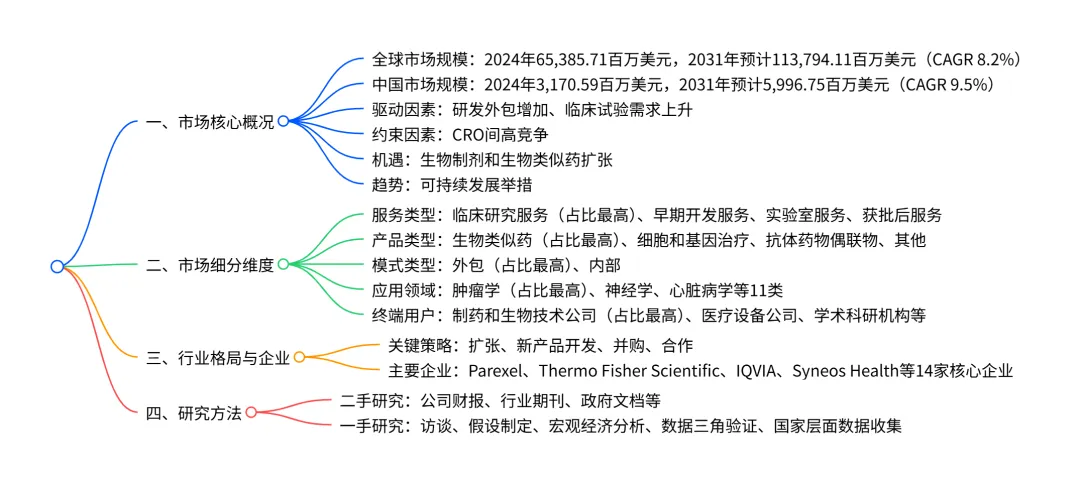 全球及中国合同研究组织(CRO)市场在 2024 年规模达65,385.71 百万美元,预计 2031 年将增长至113,794.11 百万美元,2025-2031 年复合年增长率(CAGR)为8.2%;中国市场增速更快,2024 年规模 3,170.59 百万美元,2031 年预计达 5,996.75 百万美元,CAGR 达9.5%。市场增长主要受研发外包增加和临床试验需求上升驱动,同时面临CRO 间激烈竞争的约束,生物制剂和生物类似药的扩张是核心机遇,可持续发展举措为未来趋势;细分领域中,临床研究服务(2024 年占比 45.1%)、生物类似药(2024 年占比 34.9%)、外包模式(2024 年占比 59.7%)、肿瘤学应用(2024 年占比 22.1%)及制药和生物技术公司(2024 年占比 55.9%)为各维度最大细分市场,主要参与者包括 Parexel、Thermo Fisher Scientific(PPD Inc)、IQVIA 等。
