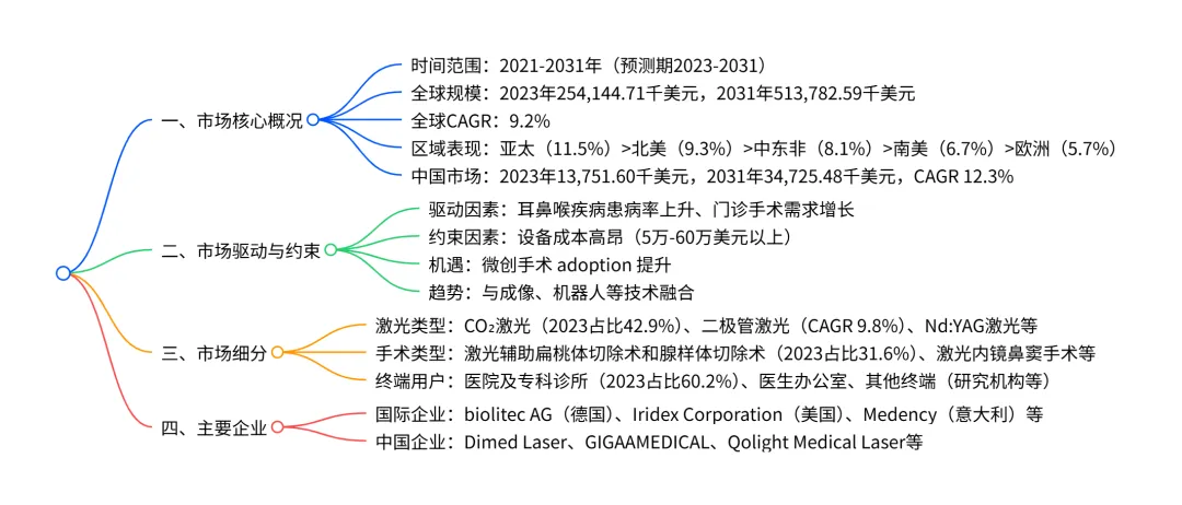 2023-2031年全球激光辅助耳鼻喉(ENT)手术市场将以9.2% 的复合年增长率扩张,从 2023 年的254,144.71 千美元增至 2031 年的513,782.59 千美元,其中亚太地区增速最快(CAGR 11.5%),中国市场增速达12.3% ;市场核心驱动因素为耳鼻喉疾病患病率上升和门诊手术需求增长,主要制约因素是设备成本高昂,而微创手术普及和技术融合是关键机遇与趋势;细分领域中,CO₂激光(2023 年市场占比 42.9%)、激光辅助扁桃体切除术和腺样体切除术(2023 年占比 31.6%)、医院及专科诊所(2023 年占比 60.2%)分别是激光类型、手术类型、终端用户中的主导板块,全球主要参与者包括 biolitec AG、Iridex Corporation、Medency 等企业。