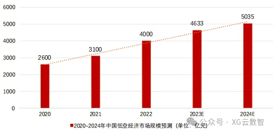 3、2020-2024年中国低空经济市场规模预测(单位:亿元)