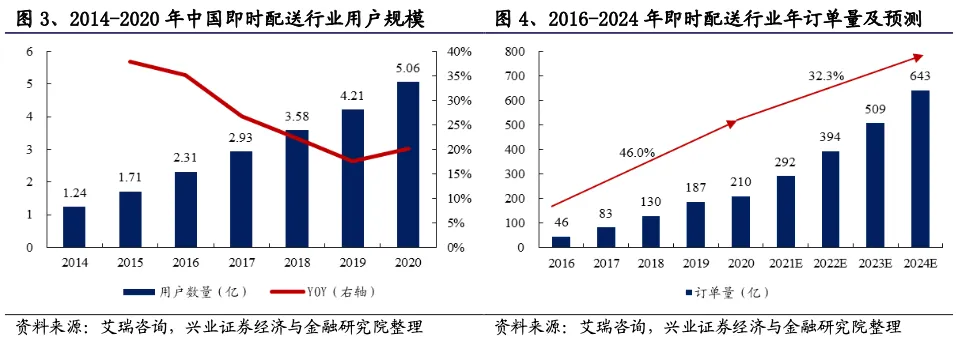 新冠肺炎疫情加速即时配送服务行业的发展,仍有大量市场有待开发。截止2020年,即时配送的用户规模已达5.06亿人,同比增长20.19%,年订单量210亿个,5年复合增长率为46.0%。考虑到当前近八成即时配送需求来自一二线城市,下沉市场具有极大发展空间,以及新服务场景不断扩展和新业态模式与消费模式持续创新,即时配送服务行业具有明显的增长潜力。根据艾瑞咨询预测,预计2024年中国即时配送服务行业的年订单量将进一步增至643亿单,5年复合增长率为32.3%。
