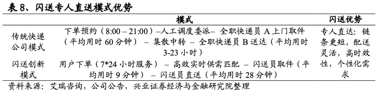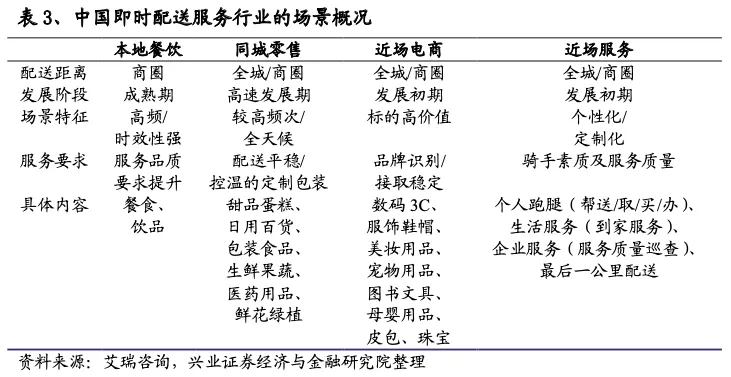1.1、即时配送时效优势明显领先,行业需求增长潜力大即时配送服务需求主要来自餐饮外卖,配送服务商特征多元化。即时配送即点对点、无中转的快速准时送达服务,时效一般在1小时以内,覆盖范围通常在五公里以内。