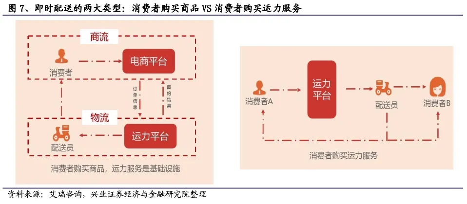 按照运力服务所起的作用,即时配送行业可以分为两大类型。在第一大类型中,消费者购买产品,运力服务只是商品履约过程中的基础设施,典型场景包括外卖、生鲜宅配等。在第二大类型中,消费者购买的标的就是运力服务本身,典型场景有专人直送等C2C的即时配送服务。