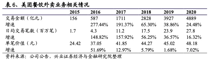 美团是市场最大的外卖服务平台,自有网络配送占比较高。美团于2013年推出外卖服务,2020年日均交易笔约2780万笔,同比增长16.32%,是市场最大的外卖服务平台,2020年交易额4889亿元,同比增长24.48%。美团配送分为1P(平台负责配送,运力来源包括供应商/加盟、自营、众包等)和3P(商家配送)模式,根据招股说明书,2017年公司自有网络配送订单比例占公司全年即时配送交易量70%以上。