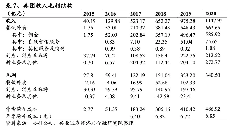 从美团的收入和毛利结构来看,餐饮外卖业务是公司收入的主要来源,2020年收入662.65亿元,占比57.72%,但毛利和利润贡献水平低于到店、酒店及旅游业务,2019年餐饮外卖毛利102.33亿元(2020年为披露分业务毛利),占比31.66%,2020年餐饮外卖经营利润28.33亿元,到店、酒店及旅游经营利润81.81亿元。餐饮外卖业务较低的毛利率水平主要受限于外卖骑手成本,2020年外卖骑手成本占餐饮外卖收入的73.48%,假定70%订单由美团自有配送网络完成,单票骑手成本约6.85元。