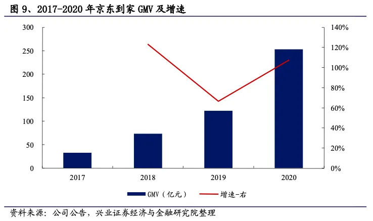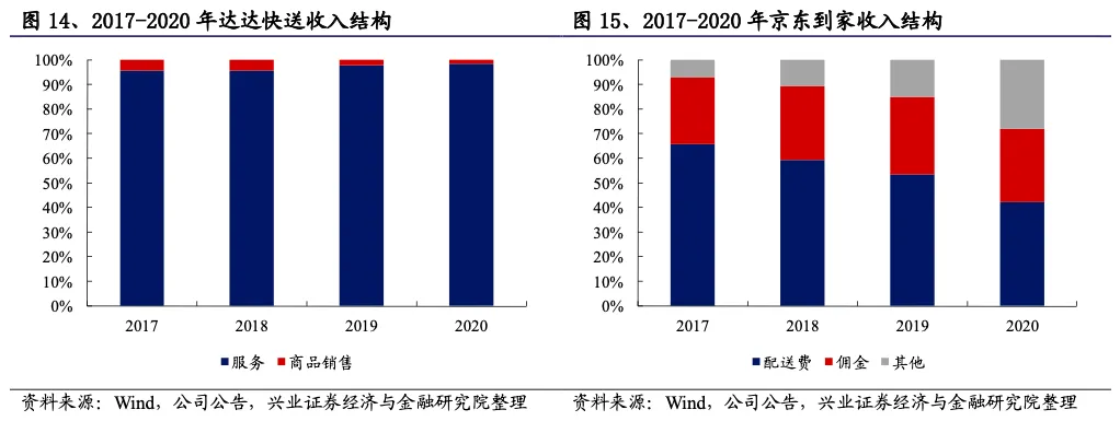 京东到家收入来源更加多元化,主要包括(1)向零售商户提供的同城配送服务;(2)使用京东到家平台向零售商收取的佣金,约为成交额的3%;(3)向品牌所有者提供的在线营销服务;(4)向零售商提供包装服务。其中向零售商提供的同城配送服务和收取的佣金收入平均占京东到家平台收入的比例超过80%,这些订单也由达达快送完成配送。