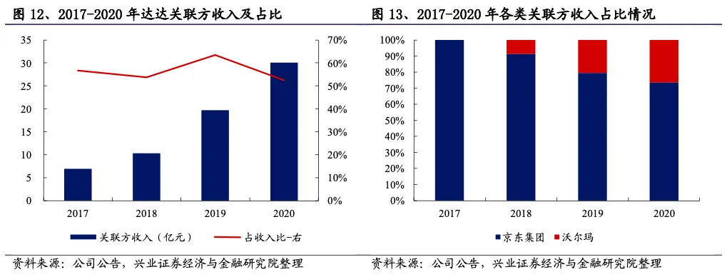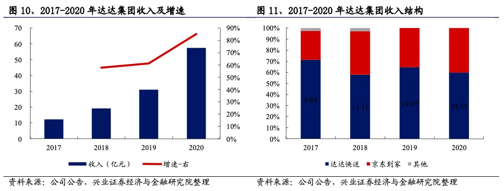 收入规模近60亿元,其中达达快送占比过半,关联收入占比较高。2020年达达集团营业收入57.40亿元,同比增长85.18%,近三年平均增速为68.07%。达达快送是公司收入主要来源,2020年达达快送、京东到家收入占比分别为59.84%和40.16%。2020年达达关联方收入达30.09亿元,占总收入之比为52.42%,其中来自京东集团和沃尔玛的收入分别为22.14亿元和7.95亿元。
