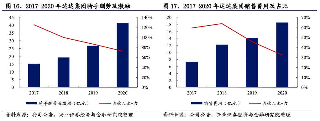 2017年以来达达快送平台的收入端95%以上来源于配送服务,是达达集团净收入的主要来源。另外,达达快送的骑手要求购买和定期更换达达快送的定制配送装备。装备销售的收入在业务逐渐稳定后,收入占比趋稳,2020年占达达快送收入的1.66%。随着达达活跃骑手未来达到的峰值,这一占比预计将继续下降,达达快送平台超过98%的收入来自用户支付的配送费用。