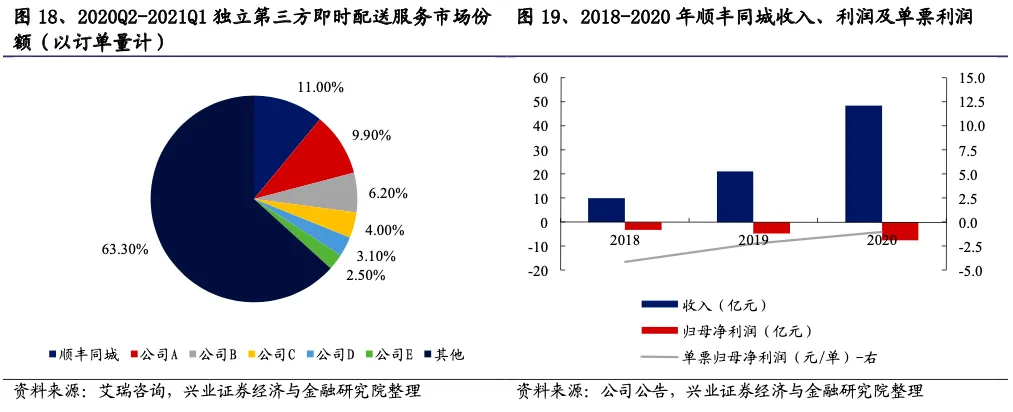 脱胎于顺丰集团,已发展为中国最大的独立第三方即时配送服务供应商。2016年,顺丰同城事业部成立,顺丰正式切入即时配送市场,主要服务麦当劳等B端客户,2018年开始向消费者和中小商家提供服务。2019年,顺丰同城事业部注册公司独立运营,同时推出“顺丰同城急送”品牌。2020年,顺丰同城业务量7.61亿单,同比增长208.7%,根据艾瑞咨询,2020Q2至2021Q1业务量占独立第三方即时配市场的11.0%,是中国最大的独立第三方即时配送服务供应商;收入48.43亿元,同比增长129.87%,归母净利润-7.57亿元,单票归母净利润-1.00元/单,单票亏损幅度持续降低。
