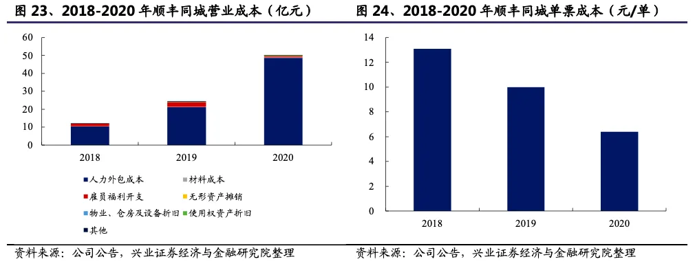 顺丰同城营业成本支出主要是人力成本。2018-2020年占比分别为97.80%、97.30%和97.81%,单票人工成本15.01、11.26和6.47元/单,暂时单票收入仍未覆盖单票人工成本,但缺口在快速缩小,2018-2020年缺口分别为2.56、1.28和0.10元/单。顺丰同城的骑手雇佣结构正在发生变化,外包比重持续提升,2018-2020年人力外包成本占营业成本的比例分别为85.36%、86.41%和96.59%。2018-2020年顺丰同城单票成本分别为15.35、11.57和6.61元/单,预计主要受益于业务结构和规模扩张。