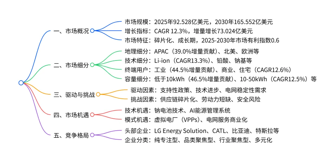 2025-2030 年全球太阳能电池市场呈加速增长态势,2025年市场规模达92.528 亿美元,预计2030年将增至165.552亿美元,期间复合年增长率(CAGR)为12.3%,增量增长达73.024 亿美元;市场结构呈碎片化特征,APAC 地区为最大且增长最快的区域(贡献 39.0% 增量增长),Li-ion 技术占主导地位(2025 年市场份额 51.2%,贡献 56.0% 增量增长),工业端为核心终端用户(2025 年市场份额 44.3%),低于 10kWh 容量产品是主流细分;驱动因素包括支持性政策、技术进步及电网稳定性需求,同时面临供应链碎片化、 skilled 劳动力短缺等挑战,AI 集成、虚拟电厂(VPPs)及钠电池技术为主要增长机遇,市场竞争集中于 CATL、特斯拉、比亚迪等企业。