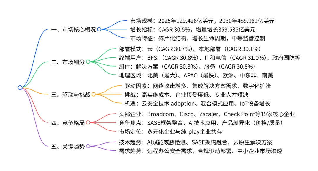 全球安全 Web 网关市场在 2025-2030 年将保持30.5% 的高复合年增长率,市场规模从 2025 年的129.426 亿美元增长至 2030 年的488.961 亿美元,增量增长达 359.535 亿美元;市场呈碎片化竞争格局,云部署(占 2025 年市场份额 57.2%)、BFSI 行业(占 2025 年市场份额 31.4%)和解决方案组件(占 2025 年市场份额 75.2%)为核心细分领域,北美是最大区域市场(占 2025 年市场份额 32.8%),APAC为增长最快区域(CAGR 30.9%);驱动因素包括网络攻击增多、集成解决方案需求增长和数字化扩张,主要挑战为实施成本高、企业接受度低及专业人才短缺,竞争焦点集中在 SASE 框架整合与 AI 技术应用,头部企业包括 Broadcom、Cisco、Zscaler 等。