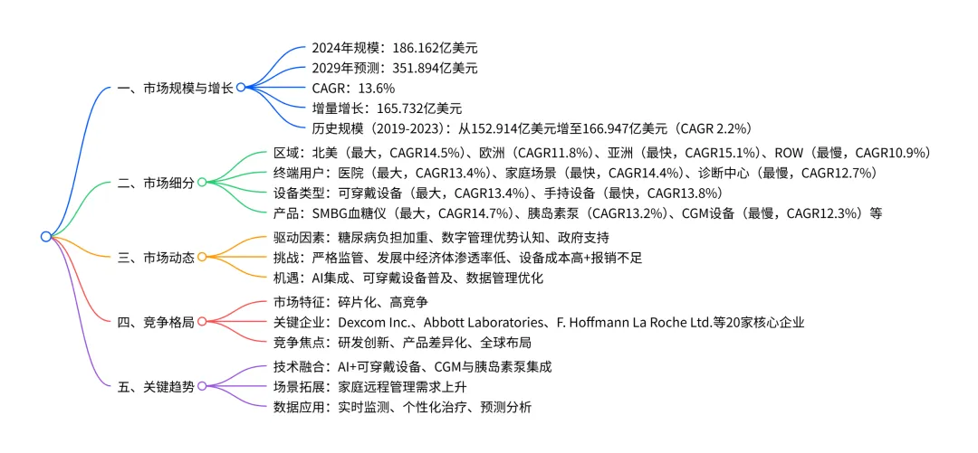 全球数字糖尿病管理市场在 2024-2029 年将保持高速增长,2024 年市场规模达186.162 亿美元,2029 年预计增至351.894 亿美元,CAGR 为 13.6%,增量增长达165.732 亿美元;市场呈碎片化竞争格局,北美为最大区域市场(2024 年占比 44.8%),亚洲为增长最快区域(CAGR 15.1%);医院是最大终端用户(2024 年占比 40.5%),家庭场景增长最快(CAGR 14.4%);可穿戴设备为最大产品类型(2024 年占比 59.8%),SMBG 血糖仪是最主要产品细分(CAGR 14.7%);驱动因素包括糖尿病患病率上升、数字管理优势认知提升及政府支持,挑战则涉及严格监管、发展中经济体渗透率低及设备成本高与报销不足,AI 集成和数据管理优化为核心发展机遇。