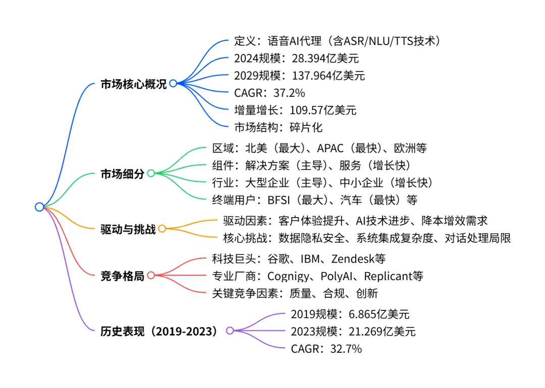2024-2029年全球语音AI代理市场呈现强劲增长态势,2024年市场规模达28.394亿美元,预计2029年将增至137.964亿美元,CAGR高达37.2%,增量增长109.57亿美元;市场呈碎片化结构,北美为最大区域市场(2024年占比 34.8%),APAC 为增长最快区域(CAGR 41.8%);组件层面,解决方案占主导(2024 年占比68.3%)但服务 segment 增长更快(CAGR 39.4%);行业层面,大型企业是主要用户(2024 年占比 74.8%),但中小企业增长更迅猛(CAGR 40.6%);终端用户中,BFSI 为最大segment(2024年占比 35.5%),汽车行业增长最快(CAGR 40.3%);市场驱动因素包括客户体验提升需求、AI 技术进步等,核心挑战为数据隐私安全与系统集成复杂度,竞争格局涵盖谷歌、IBM等科技巨头及 Cognigy 等专业厂商。