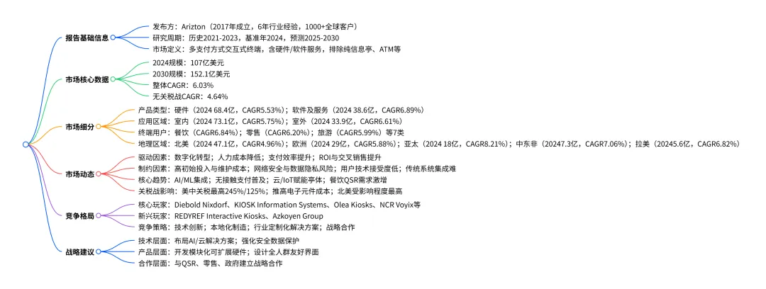 本报告由Arizton发布,聚焦2025-2030年全球自助支付亭市场,界定了其为支持多支付方式的交互式终端,2024 年市场规模达107亿美元,预计2030年增至152.1亿美元,CAGR 为6.03%;市场按产品类型(硬件、软件及服务)、应用区域(室内、室外)、终端用户(餐饮、零售等 7 大类)及地理区域划分,亚太地区为增速最快区域(CAGR 8.21%),北美为最大市场(2024 年占比 44%);核心驱动因素包括数字化转型、人力成本降低、支付效率提升,而关税战(美中关税最高达 245%/125%)、高初始投入、网络安全风险等构成制约;市场趋势集中在 AI/ML 集成、无接触支付、云/IoT赋能等方面,Diebold Nixdorf、KIOSK Information Systems等为核心玩家,行业竞争呈现技术创新与本地化布局的核心特征。