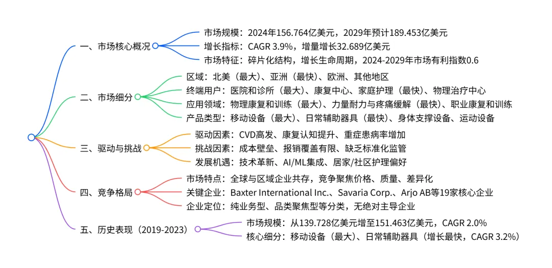 2024-2029年全球康复设备市场呈现稳步增长态势,2024年市场规模达156.764亿美元,预计2029年将增至189.453亿美元,期间年复合增长率(CAGR)为3.9%,增量增长达32.689亿美元;市场结构呈碎片化,北美为最大区域市场(2024年占比36.4%),亚洲为增长最快区域(CAGR4.6%);医院和诊所是最大终端用户(2024 年占比35.8%),家庭护理增长最快(CAGR 4.6%);物理康复和训练为最大应用领域(2024年占比47.9%),日常辅助器具为增长最快产品类型(CAGR5.0%);市场增长主要受心血管疾病(CVD)高发、康复认知提升、重症患病率增加等因素驱动,同时面临设备成本高、报销覆盖有限、缺乏标准化监管等挑战,AI 与机器学习集成、居家护理偏好上升成为主要发展机遇。