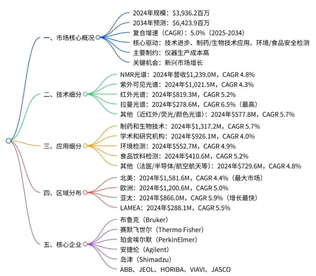 全球分子光谱市场在2024年估值为$3,936.2百万,预计2034年将达$6,423.9 百万,CAGR 为 5.0%;技术层面,核磁共振(NMR)光谱是 2024 年市场份额最高的细分领域($1,239.0百万),而拉曼光谱预计将以6.5%的最高CAGR增长;应用方面,制药和生物技术segment占比最大且增速最快(CAGR 5.7%);区域上,北美是2024年最大市场($1,581.6 百万),亚太地区将以 5.9% 的 CAGR 成为增长最快区域;市场主要驱动力包括技术进步、制药与生物技术应用拓展、环境与食品安全检测需求提升,主要制约因素为仪器生产成本高,核心企业有布鲁克、赛默飞世尔、珀金埃尔默等。