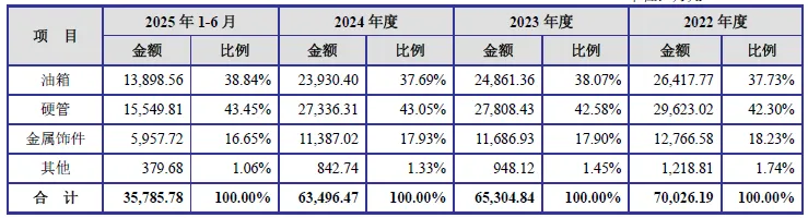 报告期内,公司综合毛利率分别为32.15%、33.01%、33.53%、31.81%,保持较高水平,主要得益于产品技术优势、客户结构优质及规模效应。分产品来看,油箱和硬管作为核心产品,毛利率高于行业平均水平,金属饰件毛利率相对稳定。