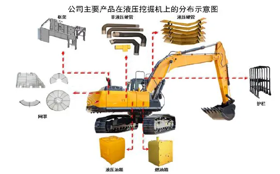 公司主营业务为液压元件及零部件的研发、生产和销售,主要产品包括油箱(液压油箱、燃油箱)、硬管(液压硬管、非液压硬管)和金属饰件(护栏、网罩、框架等),广泛应用于挖掘机、装载机、推土机等工程机械主机设备,近年来已拓展至数据中心柴油发电机组备用电源零部件领域。