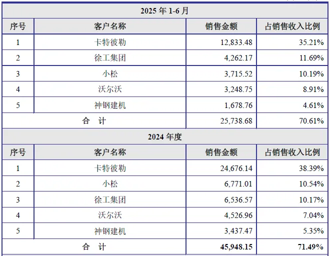 公司客户集中度较高,报告期内前五大客户销售收入占比分别为75.05%、71.62%、71.49%、70.61%,主要为全球知名工程机械主机厂商,包括卡特彼勒、小松、徐工集团、沃尔沃、神钢建机等。其中,卡特彼勒为第一大客户,2025年1-6月销售占比达35.21%,合作历史超20年;徐工集团、小松、沃尔沃等核心客户合作年限均在10年以上,客户粘性强。