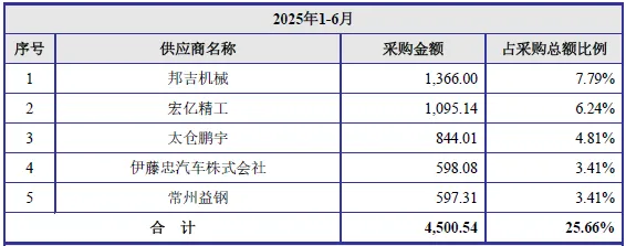 公司供应商集中度相对较低,报告期内前五大供应商采购金额占比分别为28.31%、23.97%、26.40%、25.66%,不存在依赖单一供应商的风险。主要供应商包括邦吉机械、宏亿精工、太仓鹏宇、常州益钢、冈谷钢机等,采购内容以钢材、机械配件、毛坯件为主。