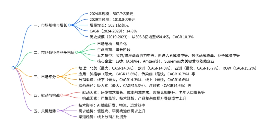 全球专科制药市场在 2024 年规模达5077亿美元,预计 2029 年将增长至10108 亿美元,2024-2029 年复合年增长率为14.8%,增量增长达5031 亿美元;市场呈碎片化竞争格局,受政府医疗支出推动的研发需求、慢性病 prevalence 上升等因素驱动,同时面临严格监管、技术短板等挑战;北美是最大市场(2024 年占比 53.5%),亚洲为增长最快区域(CAGR 16.7%);应用端肿瘤学是最大细分领域(2024 年占比 28.7%),传染病增长最快(CAGR 16.7%);分销渠道中线下仍占主导(2024 年占比 78.5%),但线上增速更快(CAGR 16.6%);给药途径以吸入式为主(2024 年占比 44.2%),且增长领先(CAGR 15.3%),行业头部企业包括 AbbVie、Amgen 等 19 家核心企业。