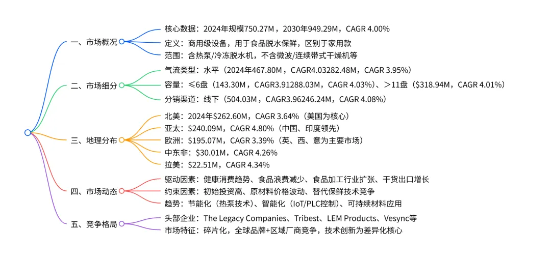 全球商用食品脱水机市场在 2024 年规模达$750.27百万,预计2030年将增长至$949.29百万,CAGR 为4.00%,核心驱动因素包括健康意识提升、食品浪费减少需求及脱水食品出口增长;市场按气流类型(水平占比 62.35%)、容量(11 盘以上占比 42.51%)、分销渠道(线下占比 67.18%)细分,北美(35% 全球份额)和亚太(4.80% CAGR) 为核心区域,北美主导市场而亚太增长最快,主要挑战包括初始投资高、原材料价格波动及替代保鲜技术竞争,头部企业通过技术创新(如智能控制、节能设计)和渠道拓展维持竞争力。