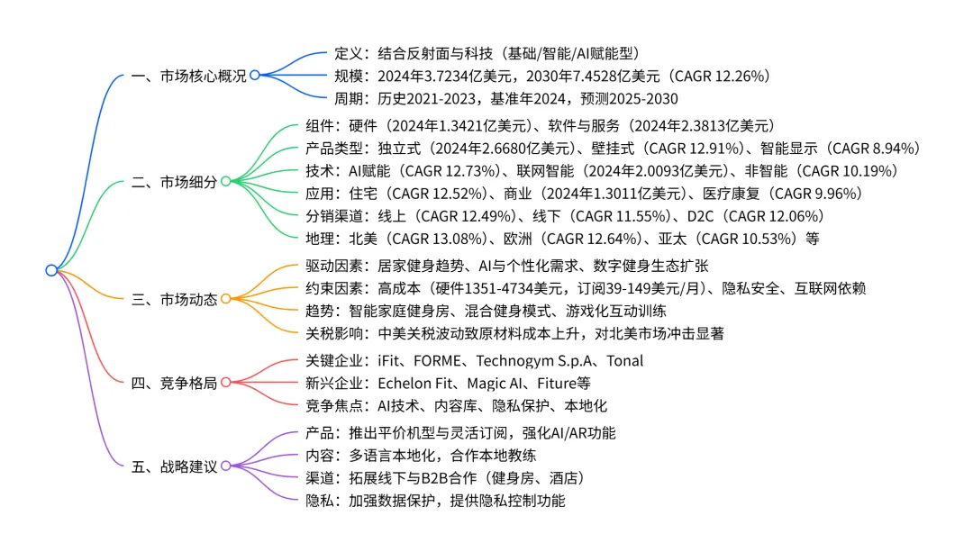 全球健身镜市场在 2024 年估值为3.7234亿美元,预计2030年将达7.4528亿美元,CAGR 为12.26%,受居家健身趋势、AI 技术融合及健康意识提升驱动;市场以北美(2024年占比 45.38%) 为主要市场,AI 赋能型产品(CAGR 12.73%)和住宅应用场景(CAGR 12.52%)增长最快,同时面临设备与订阅成本高、隐私安全及互联网依赖等约束,竞争聚焦技术创新、内容生态与本地化布局。
