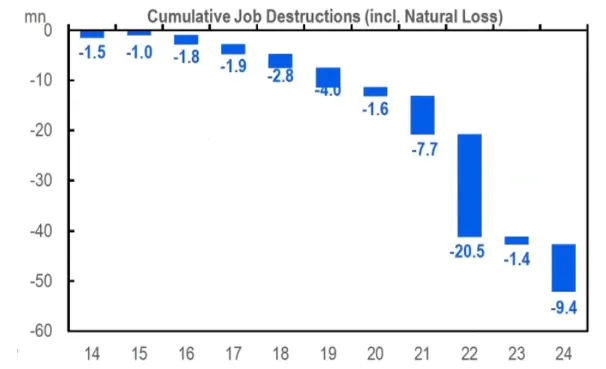 新经济的对GDP增长的支撑可完全抵消房地产对增长的拖累自2014年,城市就业岗位流失(包括自然减少)累计已达5360万