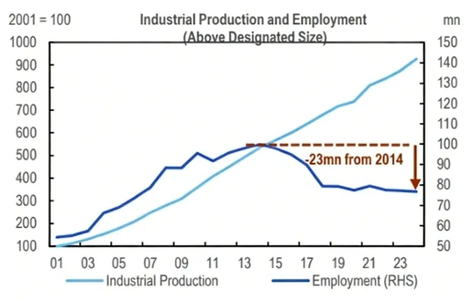 自2014年峰值,大型工业企业中约有2300万个工作岗位因自动化而消失
