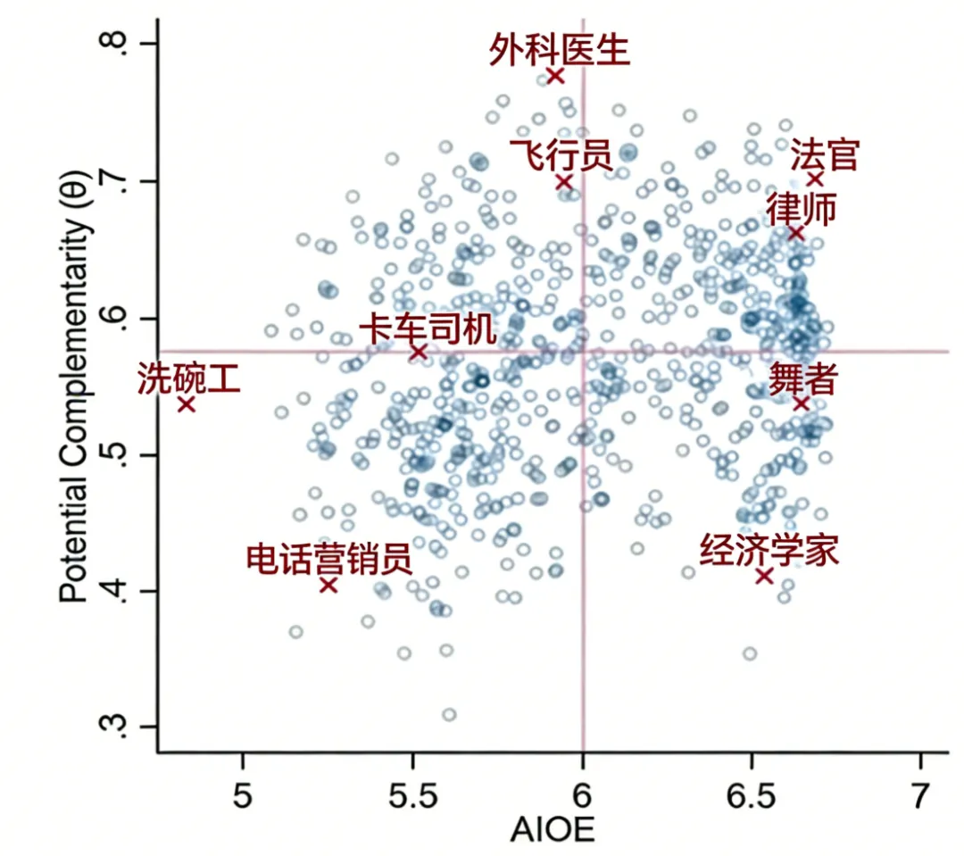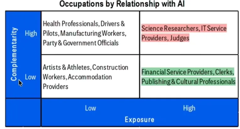 Citi基于IMF框架,将AI对就业的潜在影响,分为曝光度和互补性两个维度。曝光度:职业的工作内容和AI能做的事情重合度有多高,越弱越不易替代互补性:即工作任务与AI能力之间的互为补充性;越强越不容易被替代横轴代表AI对岗位的替代程度,数值越高,说明该职业的任务越容易被算法和自动化技术替代。纵轴代表人与算法的潜在互补性,数值越高,说明该职业中人与算法协作、发挥独特价值的潜力越大,而不是被简单替代。