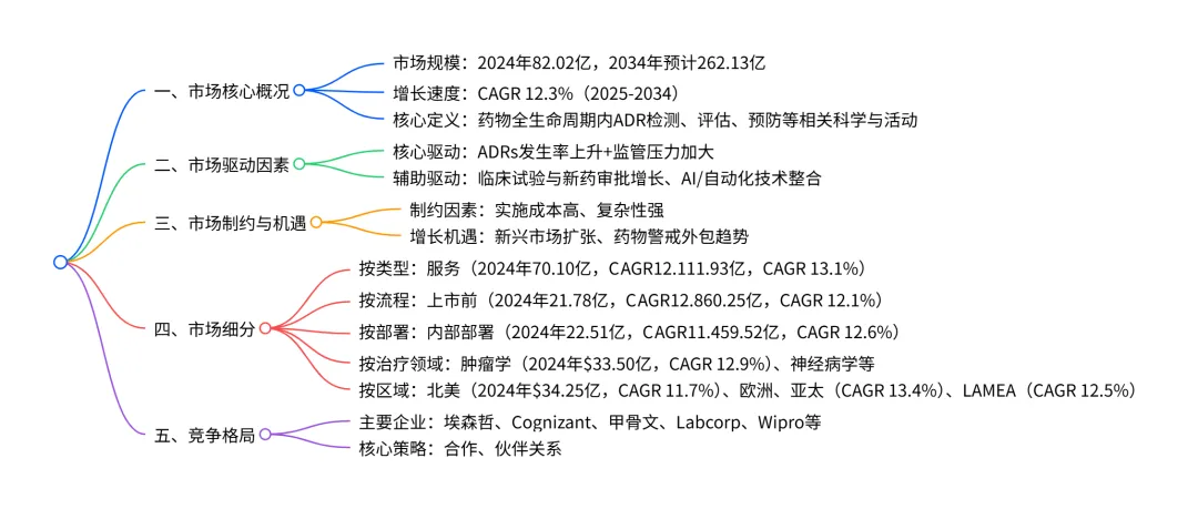 2024-2034 年全球药物警戒市场呈现强劲增长态势,2024 年市场规模达$82.02亿美元,预计2034年将增至$262.13 亿美元,年复合增长率(CAGR)为 12.3%。市场增长主要受不良药物反应(ADRs)发生率上升、监管压力加大、临床试验与新药审批量增长及 AI 和自动化技术在药物安全监测中的整合等因素驱动,但面临实施成本高、复杂性强的制约;同时,新兴市场扩张与药物警戒外包趋势为市场提供重要增长机遇。市场按类型可分为服务(2024 年占比 85.5%)和软件(CAGR 13.1%),按流程分为上市前(CAGR 12.8%)和上市后(2024 年占比 73.4%),按部署模式分为内部部署和合同外包(2024 年占比 72.6%,CAGR 12.6%),按治疗领域以肿瘤学(2024 年占比 40.8%,CAGR 12.9%)为主;区域上,北美为 2024 年最大市场(占比 41.8%),亚太地区预计将以 13.4% 的 CAGR 成为增长最快区域,主要企业包括埃森哲、 cognizant、甲骨文等。