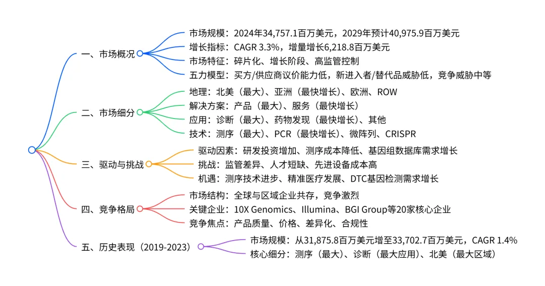 2024-2029 年全球基因组学市场呈现稳步增长态势,2024 年市场规模达 34,757.1 百万美元,预计 2029 年将增至 40,975.9 百万美元,年复合增长率 3.3%,增量增长 6,218.8 百万美元;市场结构呈碎片化,供应商市场有利指数维持 0.8,买方与供应商议价能力均较低,新进入者威胁中等;北美为最大市场(2024 年占比 39%),亚洲是增长最快区域(CAGR 4.2%);产品是最大解决方案细分(2024 年占比 62.9%),服务增长最快(CAGR 3.8%);诊断为主要应用领域(2024 年占比 49.1%),药物发现增长领先(CAGR 4.5%);测序技术占比最高(2024 年 44.3%),PCR 技术增长最快(CAGR 4.1%);市场驱动因素包括基因组学研发投资增加、基因测序成本降低等,主要挑战为监管差异、专业人才短缺及先进设备成本高,AI 技术融合与精准医疗发展为核心机遇。