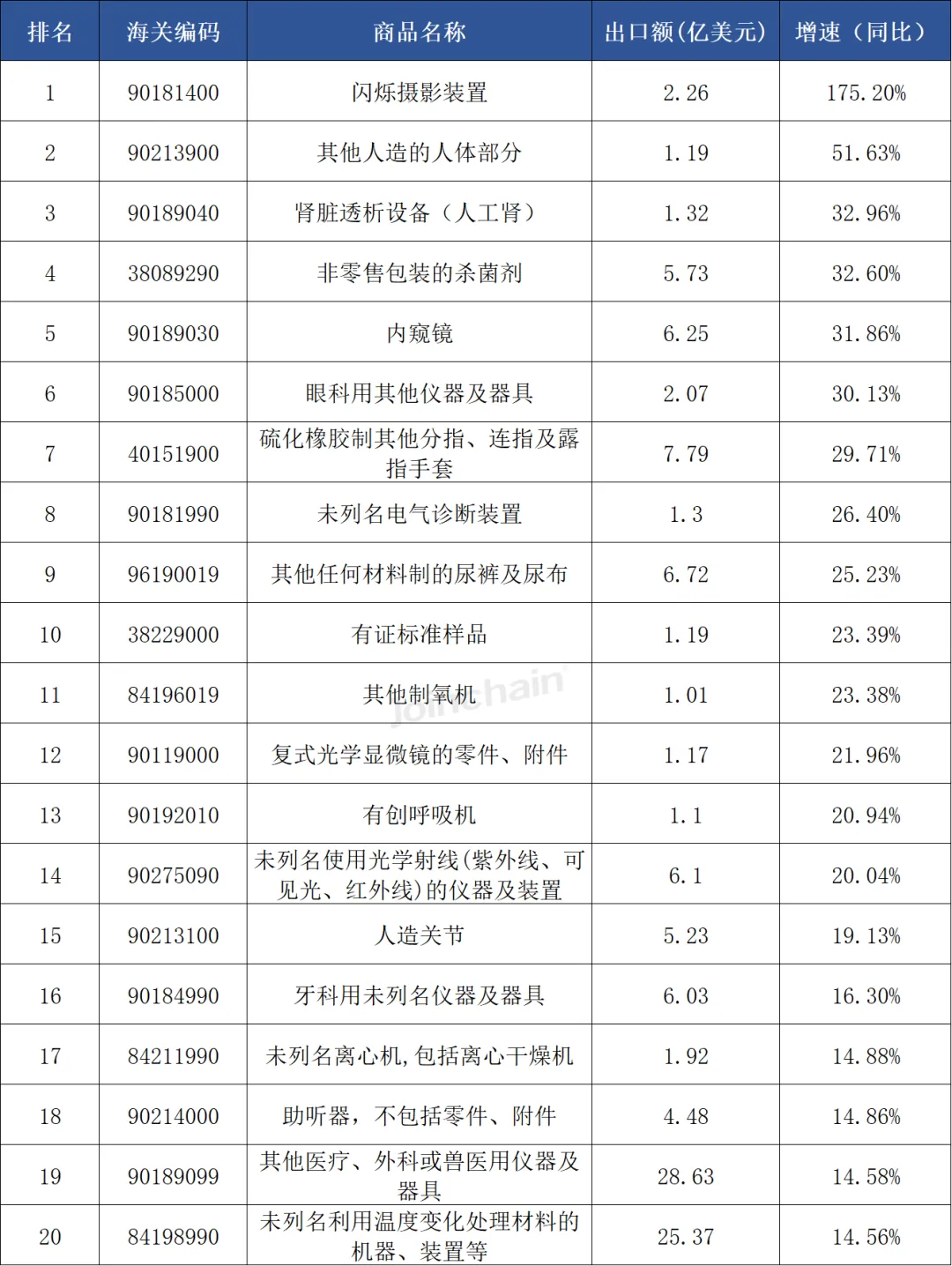 表 3 2025年中国医疗器械各商品出口额增速排行(TOP20)