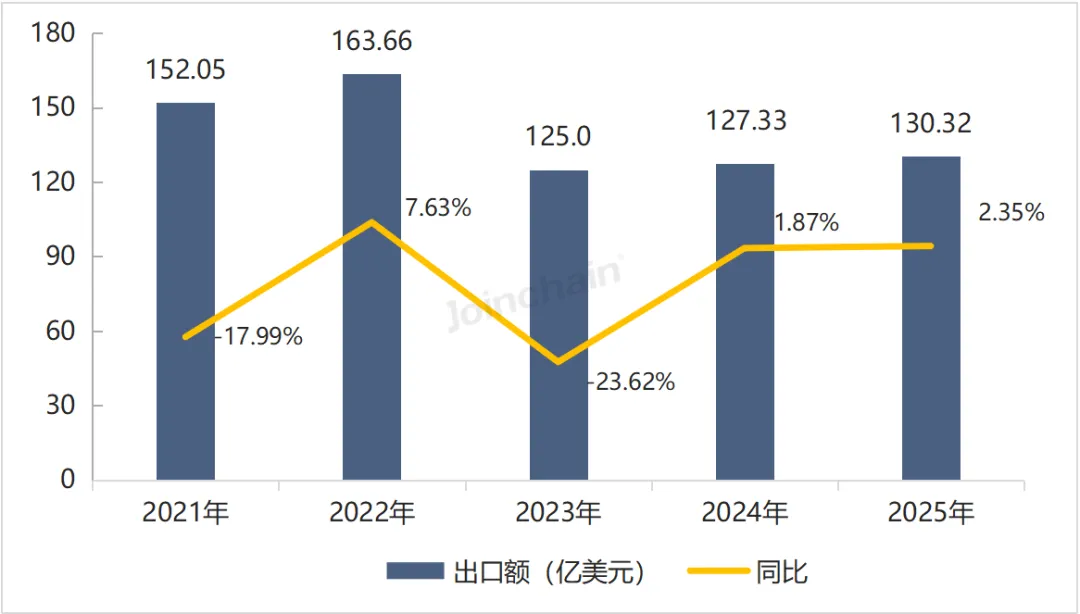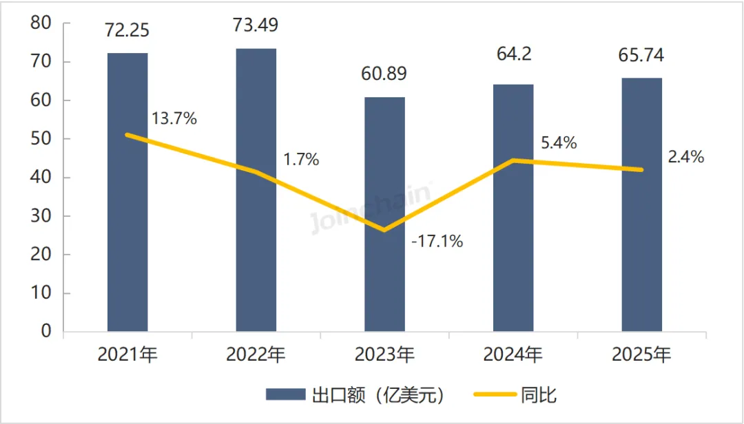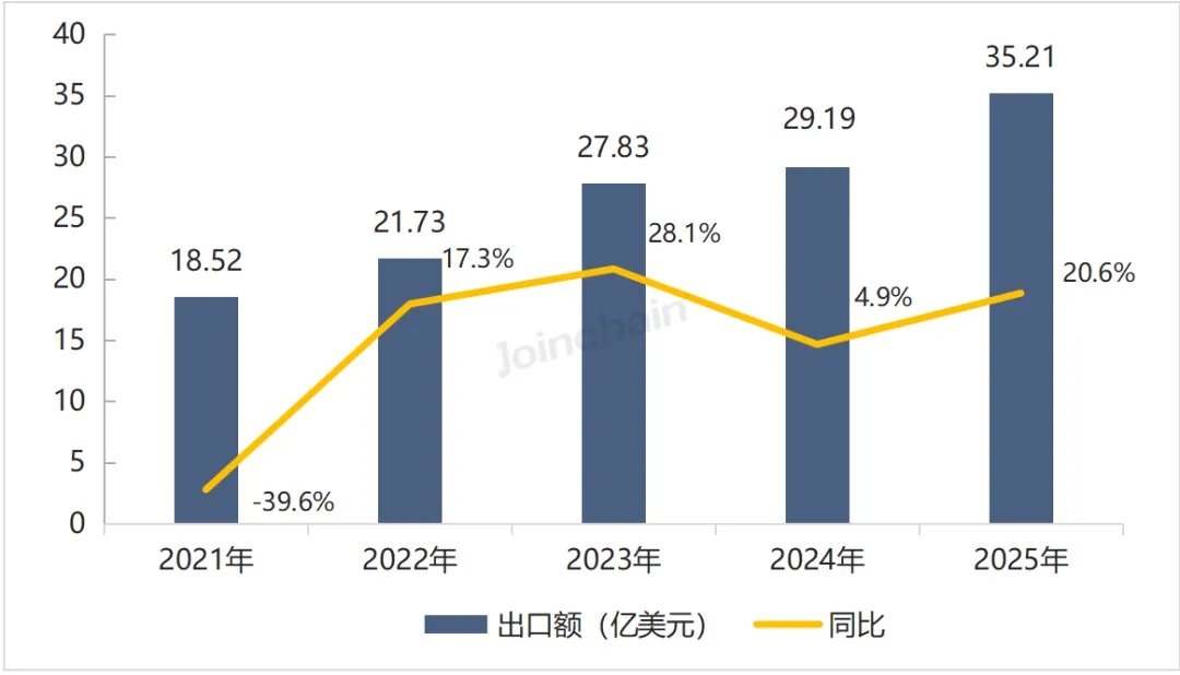 图 1 2021-2025年我国医疗器械出口额及同比增长率