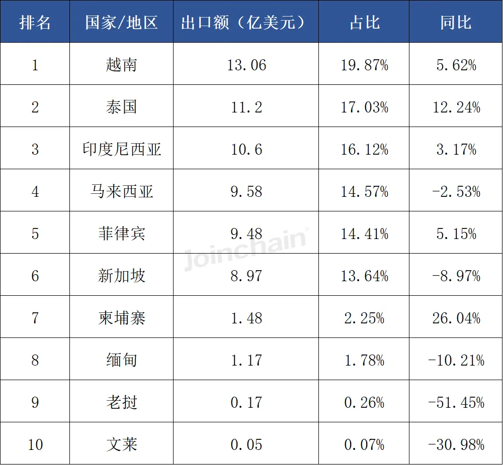 表 7 2025年我国医疗器械与东盟国家出口额分布情况