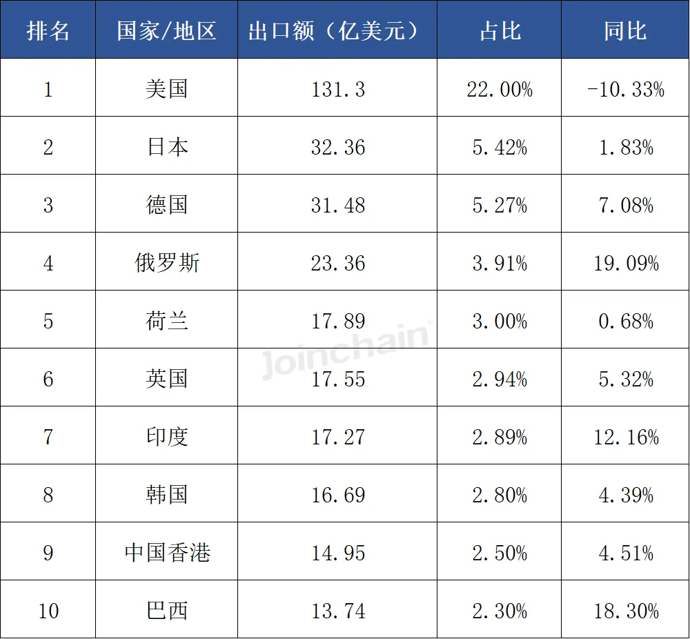 表 8 2025年我国医疗器械出口额Top10国家/地区