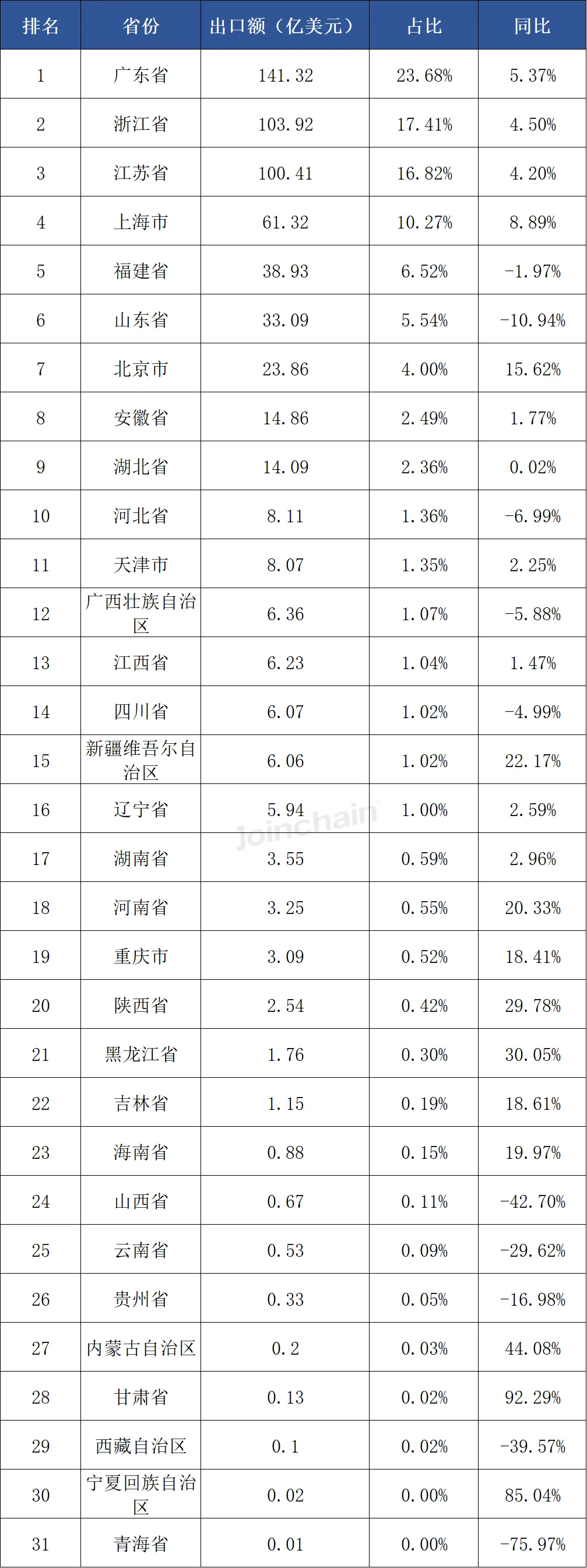 表 10 2025年我国医疗器械出口额省份(直辖市、自治区)分布情况