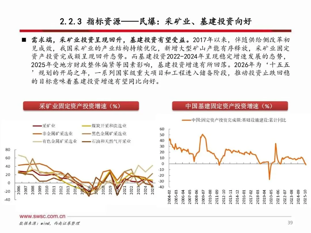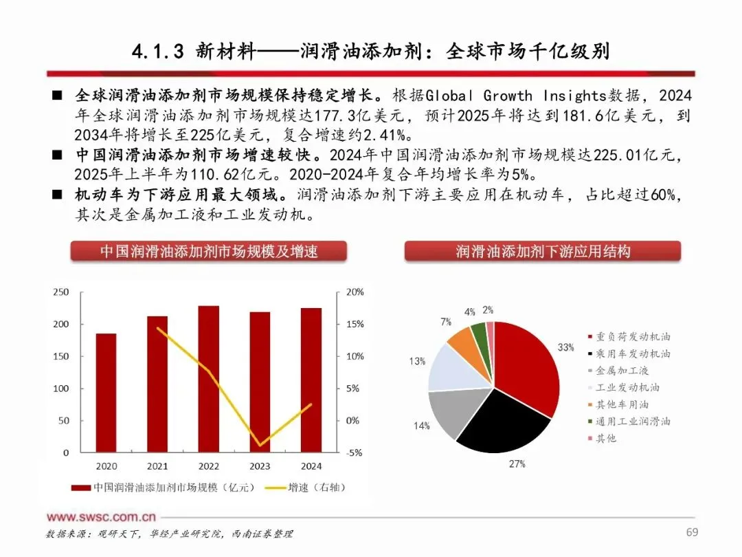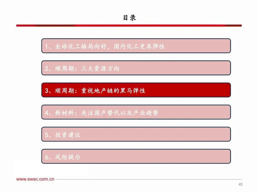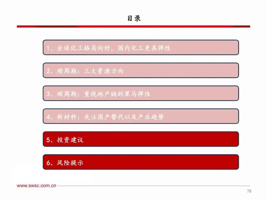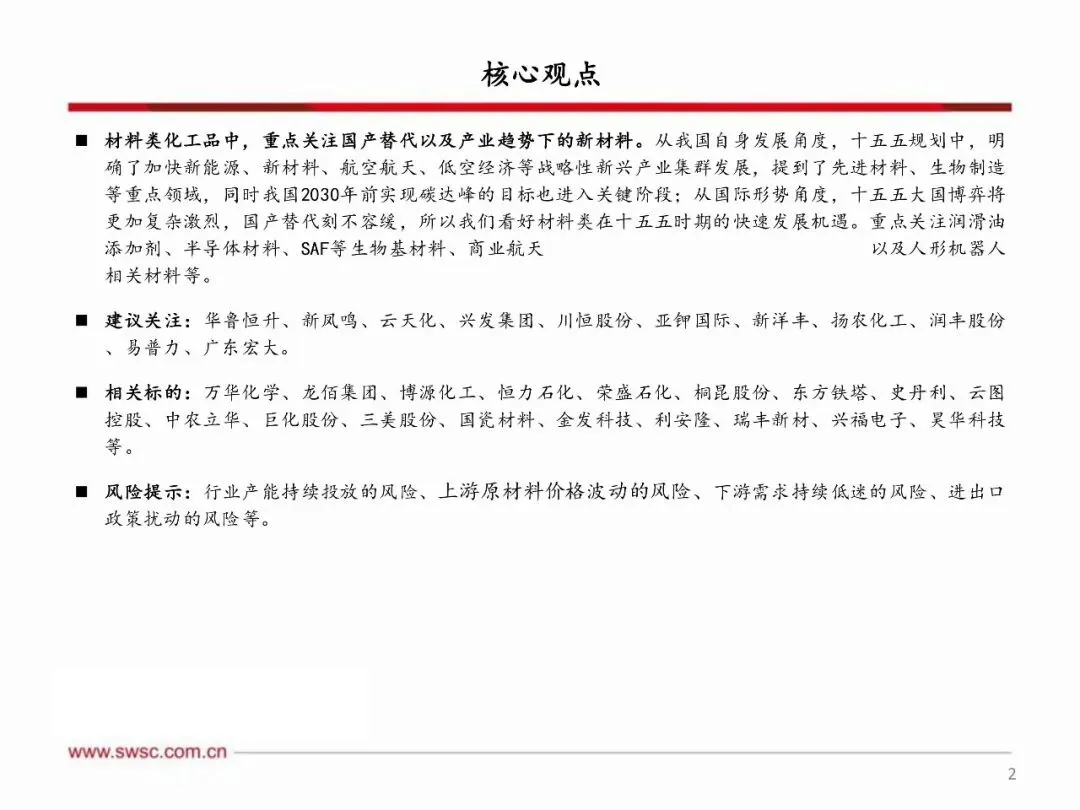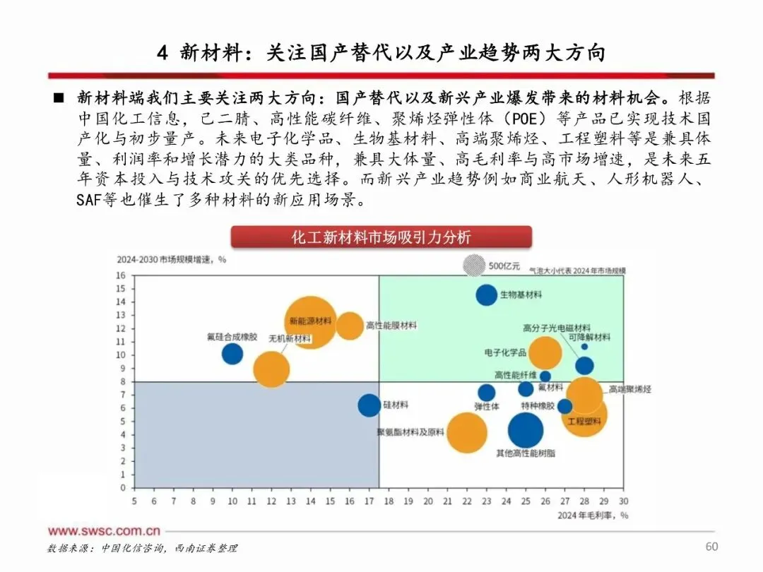顺周期资源属性化工品及具有黑马属性的地产链化工品值得关注,同时新材料领域国产替代和产业趋势带来快速发展机遇。 资源属性化工品包括磷矿、钾肥等矿产资源,以及农药、炼化、制冷剂等指标资源,还有复合肥、农药制剂等渠道资源,这些领域受益于供需格局改善和政策推动,具备较大上涨空间。地产链化工品在政策刺激和供需改善预期下,有望走出黑马行情。新材料方面,关注国产替代加速的湿电子化学品、电子特气、润滑油添加剂等,以及商业航天、人形机器人、SAF等新兴产业趋势带来的材料需求增长,这些领域将受益于技术突破和市场需求扩大,实现快速发展。