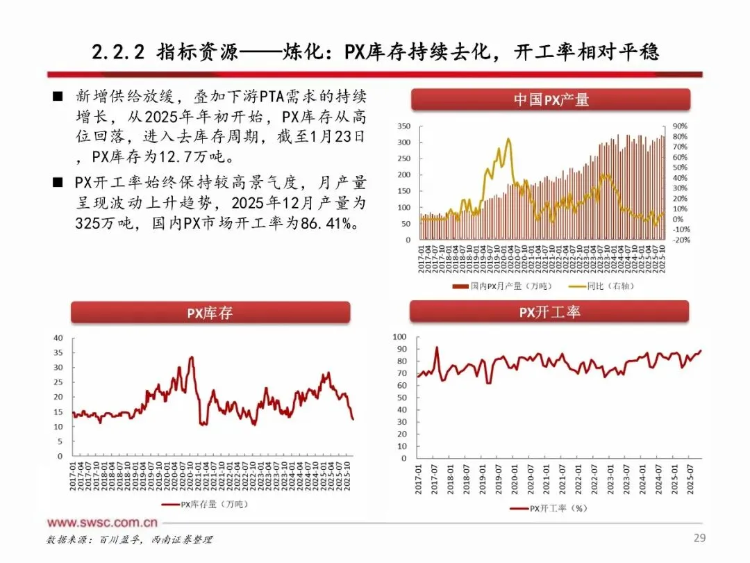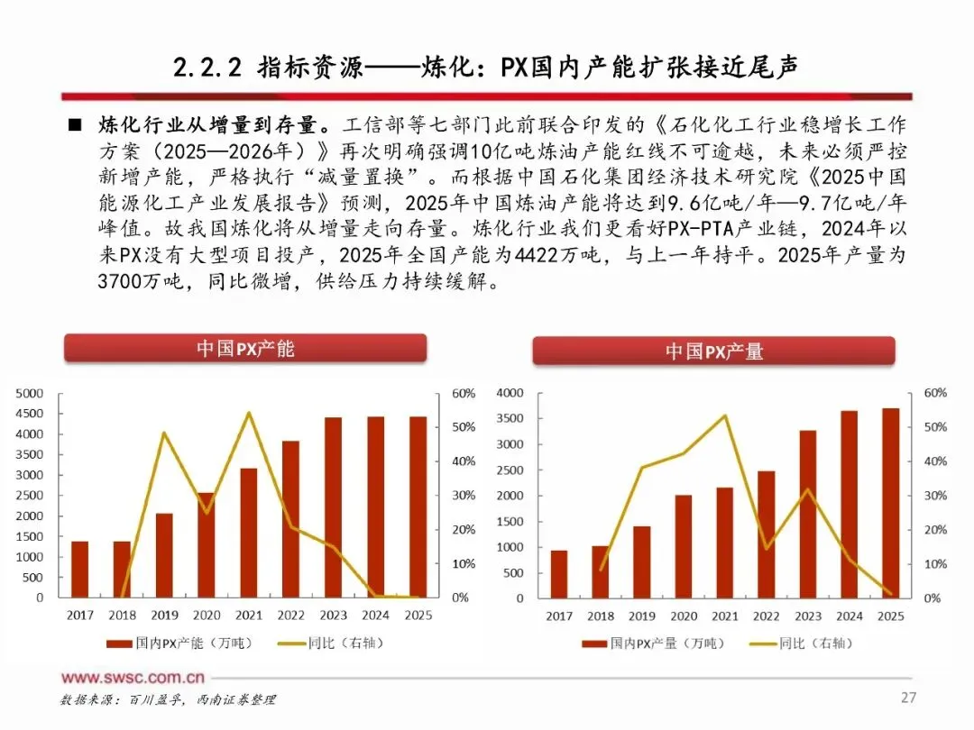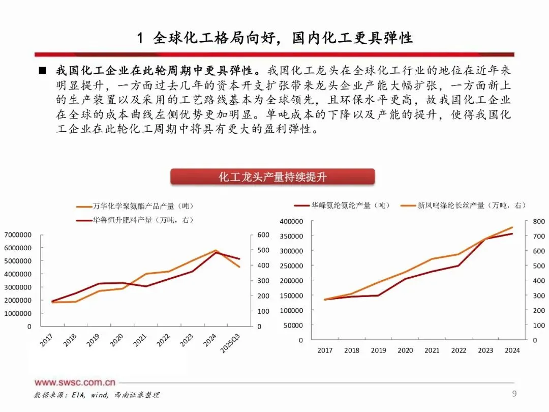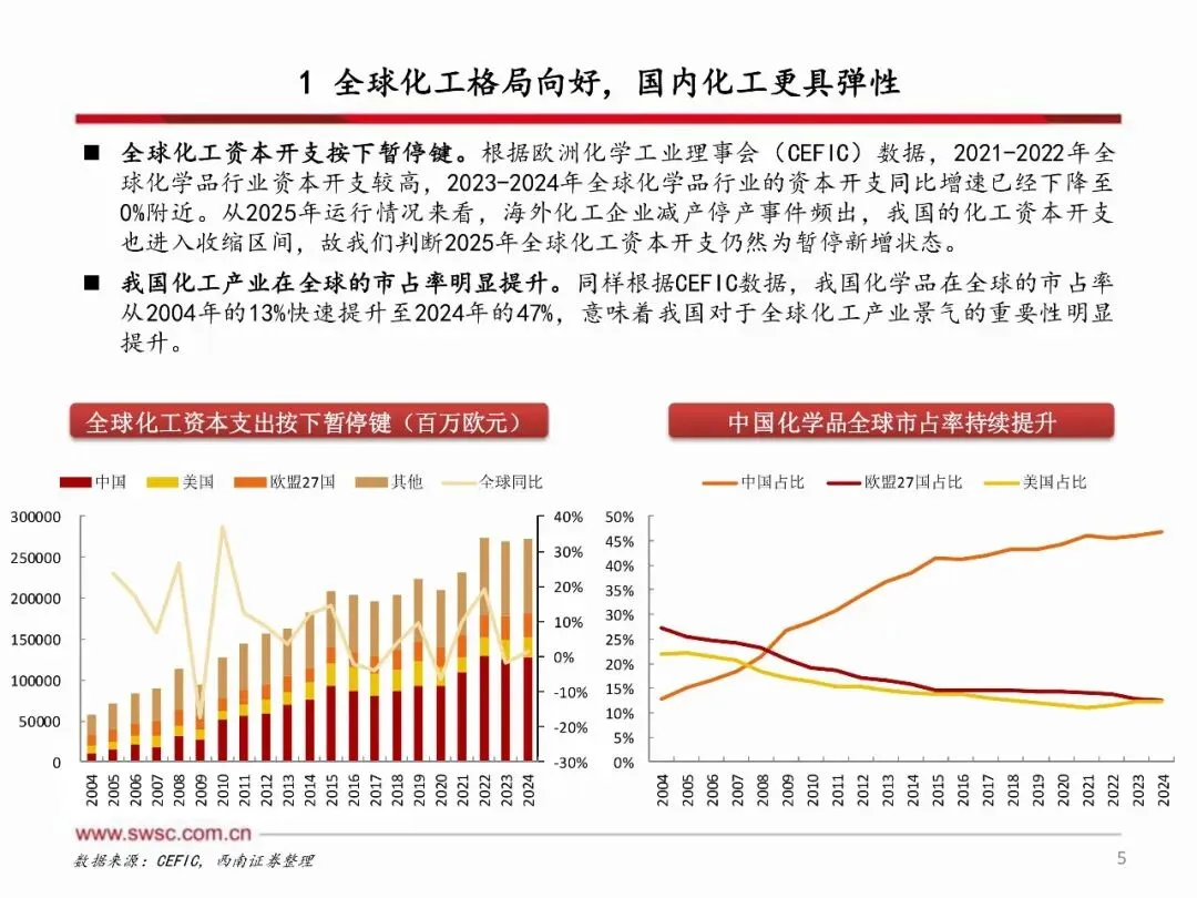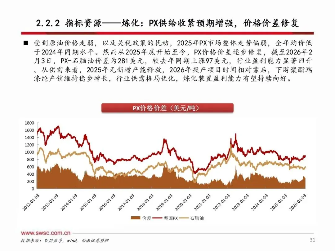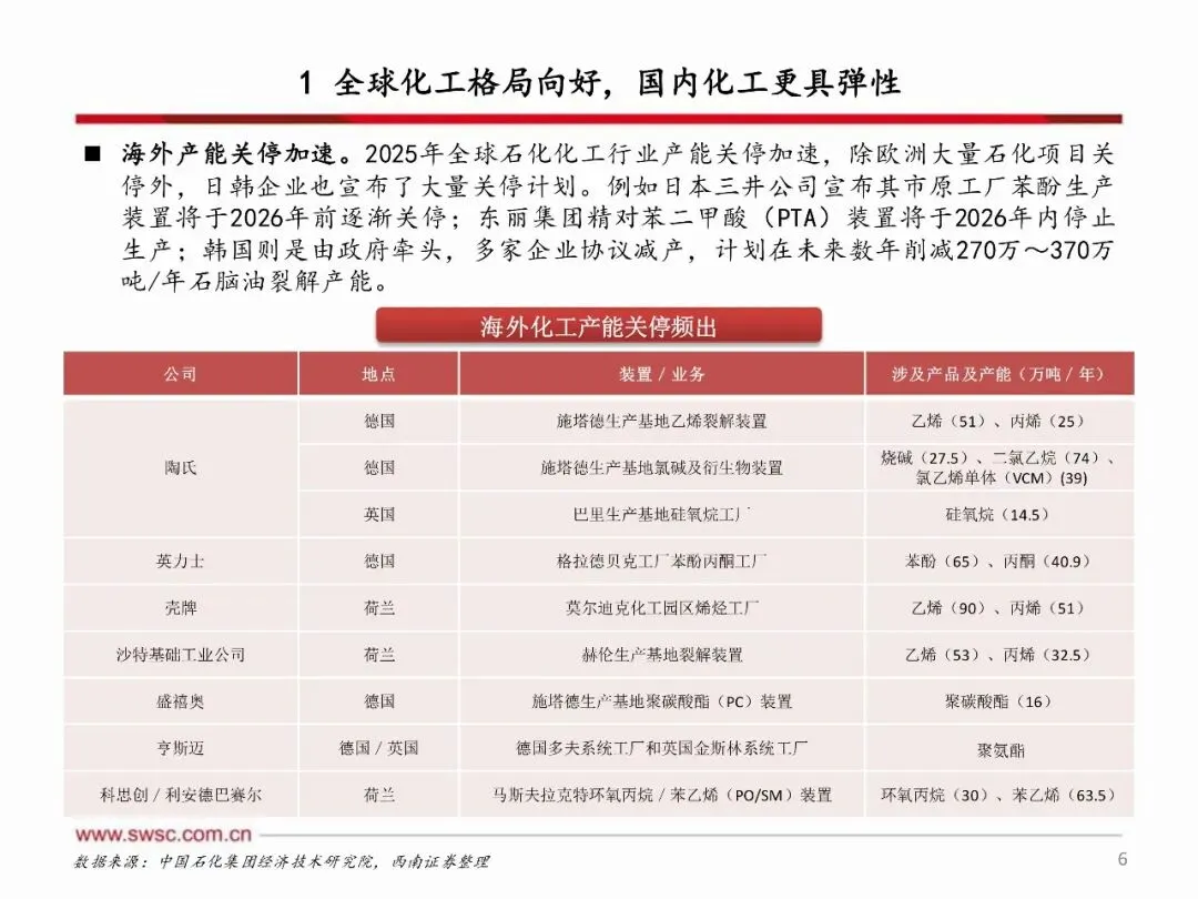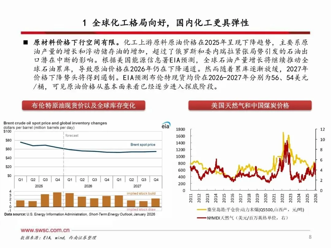 2026年,海外化工产能加速退出,国内化工产能投放明显放缓,供给端进入收缩阶段,而需求端在美国经济展现韧性、中国提振内需的政策推动下,供需改善有望超预期。原材料方面,原油、天然气等能源品种下行空间有限,化工行业成本端有望走出左侧周期。国内化工企业通过过去几年的资本开支扩张,已具备坚实的利润基础和可观的利润弹性,有望在此轮周期中实现更大盈利增长。