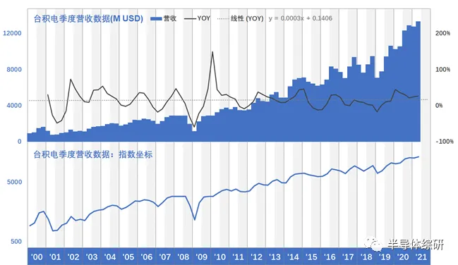 由图可见,从2000年至今,台积电的营收一直保持高速增长。从2000年到2020年,其营收已经是增长到最初9倍的情况下,其季度年均增长率基本维持在15.5%的水平上下,始终没有大的变化。即便在2001年和2008年分别遭遇IT产业泡沫破裂和次贷危机的严重影响,也能迅速调整回来。在指数坐标上,台积电的营收数据几乎是一条平稳向上的直线,其业务的强大生命力由此可见一斑。