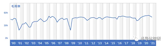 上图是台积电历年的季度毛利率数据。可以明显看到,其在05、06年开始,就能够将平均毛利率稳定在45%以上,甚至保持一定速度的增长。而这个时间点基本对应于台积电90节点工艺营收高速增长的时间。而90nm不仅是恰好是8吋向12吋转变的时代,也是铜互连工艺开始广泛应用的节点。