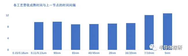 各个工艺节点在到达最大值的顶点的位置收到噪声干扰较大,不容易精确定位。而其在上升阶段中达到最大值50%点的位置则相对明确。所以,以平均最大值的一半为基准阈值,也就看各个工艺营收占比达到16%的时间作为该工艺成熟的时间点来判断各个工艺节点的发展进度。