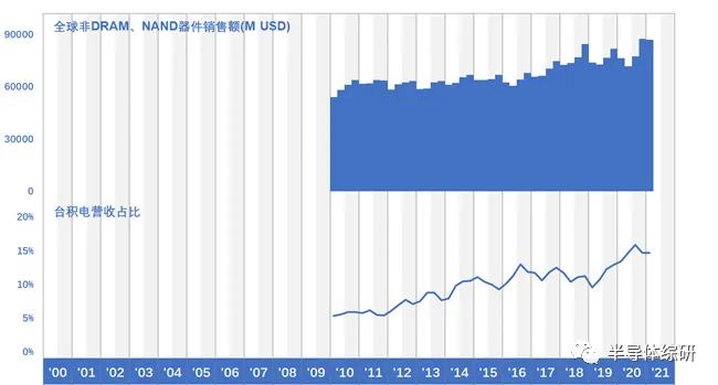 为研究这一点,我将SIA公布的半导体器件数据减去TrendForce公布的全球DRAM和NAND的销售数据,得到一个大致可供参考的非存储器器件的市场数据,并以此和台积电的营收数据进行比较。