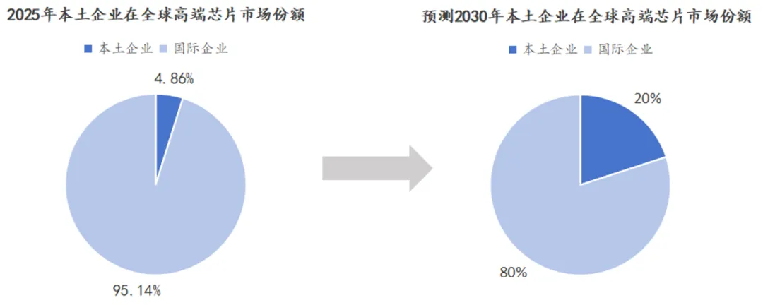 2、中国市场显著特点——国产替代加速:2030年本土企业在高端芯片市场份额有望从当前4.86%提升至20%左右。