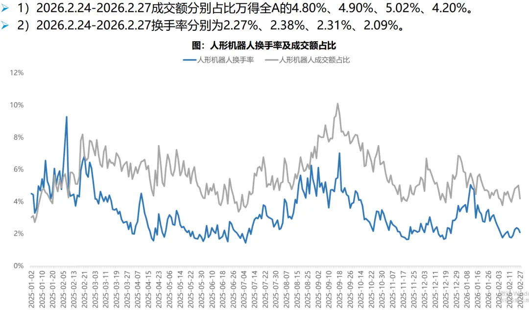 关键结论:关键的是,目前机器人交易热度处于市场低位,显然机器人板块整体位置适中,随T链催化逐步推进,Optimus Gen3有望于3月发布,看好板块持续性行情。建议逢低优先布局T链,若实际发布效果超预期将带来板块性贝塔机会,0-1的赛道,核心产业逻辑没问题,筹码又不贵,买在无人问津时。