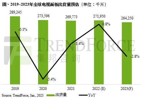 2023年国际环境仍陷入俄乌冲突与高通胀的阴霾,经济疲软对于仅以消费性市场支撑的电视销售势必造成冲击。TrendForce集邦咨询预估2023年全球电视面板出货量年减2.8%,达2.64亿片。