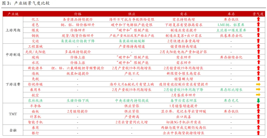 上游周期:(1)化工:下游需求旺盛,拉动资源品持续提价;“碳中和”相关产品维持高景气。(2)煤炭:进口煤价倒挂叠加供需紧平衡,煤炭景气度回温;“碳中和”政策将带来产能平稳,煤价中枢有望上移。(3)有色:供需紧平衡叠加碳中和政策支撑有色高景气度。(4)钢铁:需求稳中有升,供给面临“双降”,景气将趋于上行。(5)交运:海运价格指数短期回落,中长期受益于海外需求复苏,出口景气度有望持续改善;未来“高铁+快递”模式将显著提高邮政快递行业景气度。