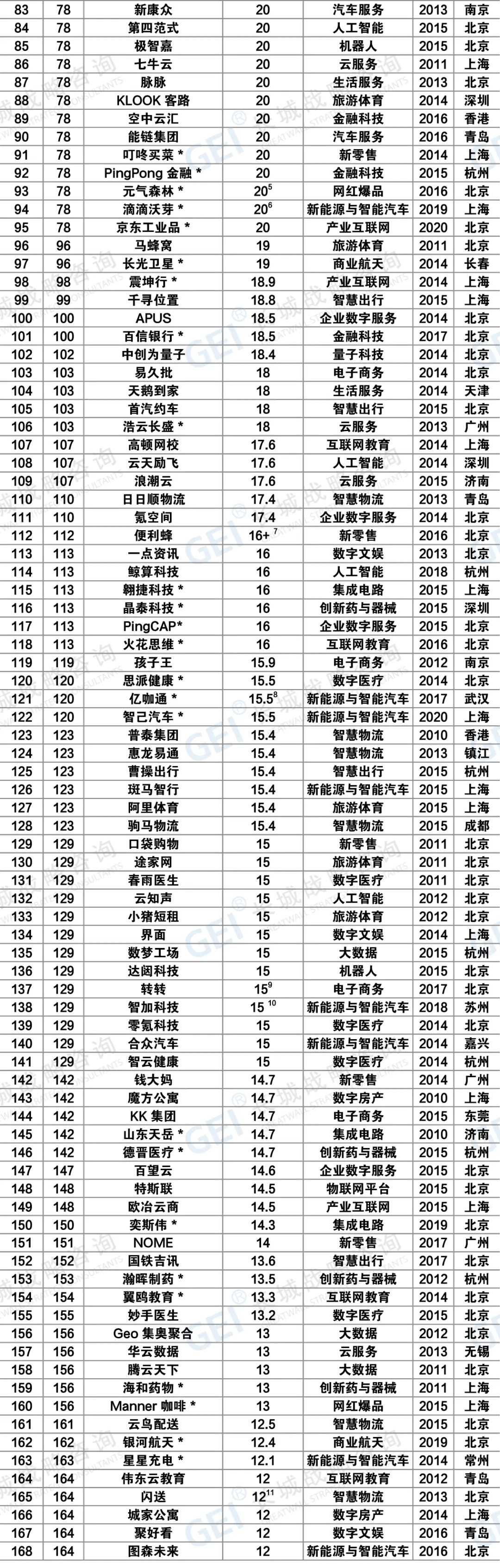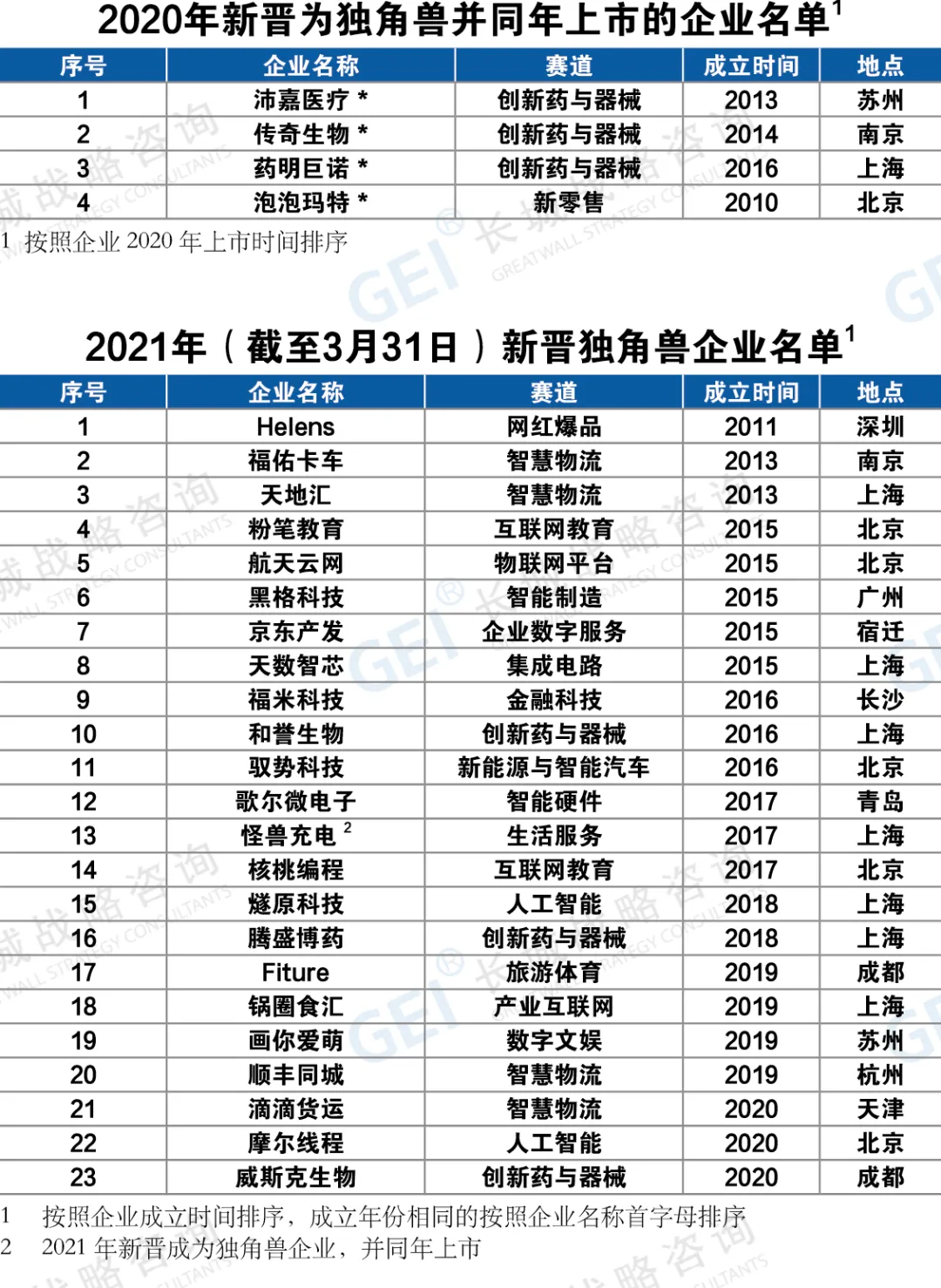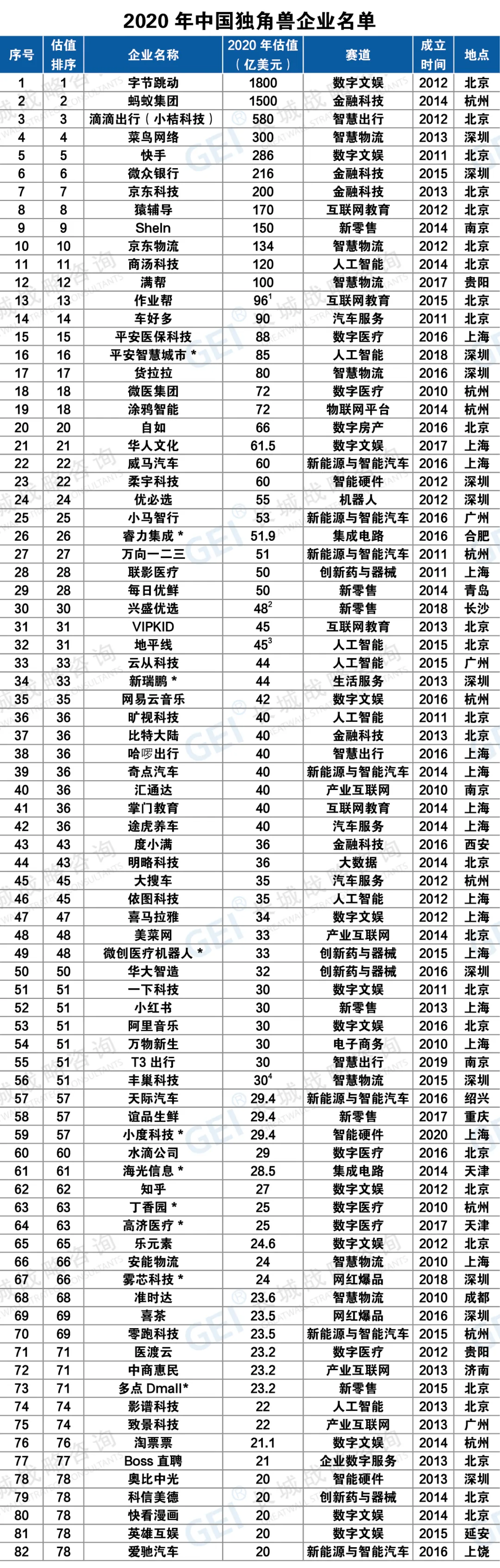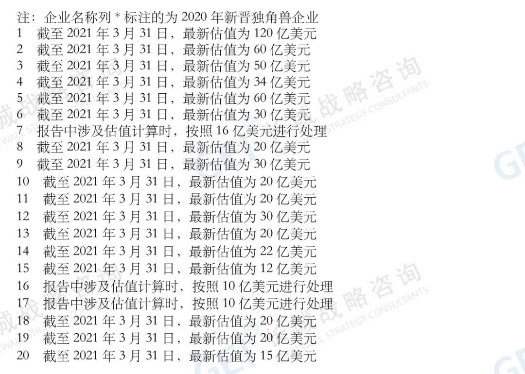 报告显示,2020年中国独角兽企业251家,总估值首次超万亿美元。相较于前一年,2020年新晋独角兽企业72家,其中26家由潜在独角兽企业成长而来。上市已“毕业”独角兽24家,创立时间超十年毕业独角兽4家。2020年中国超级独角兽企业(估值超百亿美元)12家(新增5家),估值占比超五成。超级独角兽分别为字节跳动、蚂蚁集团、滴滴出行、菜鸟网络、快手、微众银行、京东科技、猿辅导、SheIn、京东物流、商汤科技、满帮集团。新晋成为超级独角兽的有微众银行、猿辅导、SheIn、商汤科技和满帮集团。12家整体估值占中国独角兽企业群体总估值的52.6%。2020年独角兽企业分布于27个赛道、88个细分赛道。与前四期独角兽企业分布的赛道相比,2020年新出现网红爆品、商业卫星等9个新赛道,其中,创新药与器械赛道新晋独角兽企业数量最多,为11家。独角兽企业在引领新业态、开辟新赛道方面成绩卓著。2020年的独角兽企业分布于29座城市,京津冀、长三角、珠三角、成渝地区有近九成独角兽集聚。其中,北京82家,上海44家,杭州25家,深圳20家,广州12家,南京11家,天津9家,青岛8家,成都5家,西安、济南、重庆、香港、武汉、苏州、常州均为3家。长春、常州、渭南3座城市首次出现独角兽。疫情没有改变独角兽企业受资本追捧的热度,和2020年互联网相关企业在国际金融市场上呼风唤雨一样,独角兽企业的融资、上市之路呈现红火姿态。报告显示,2020年新获融资独角兽企业为127家,远超2019年(为82家)。互联网教育、新能源与智能汽车、创新药与器械、网红爆品等为融资热点赛道。互联网教育赛道融资活跃度高,2020年新获融资总额居首位,且资本呈现向头部企业集中的态势;汽车全产业链均有独角兽企业布局,新能源与智能汽车赛道独角兽企业新获融资企业数领先;新冠疫情和政策利好生物医药领域企业,创新药与器械、数字医疗赛道新获融资企业数、上市企业数量领先;网红爆品赛道集中涌现独角兽企业,备受资本青睐。头部投资机构仍是独角兽企业背后主要的投资力量,重点布局新零售、创新药与器械和企业数字服务等赛道。红杉资本、IDG资本、经纬中国、高瓴资本、华兴资本、云锋基金、五源资本(晨兴资本)、中金资本、启明创投、Temasek淡马锡、顺为资本、真格基金、中信产业基金、鼎晖投资、华平投资、GGV纪源资本、招银国际、SIG海纳亚洲、创新工场等19家头部投资机构参投独角兽数量均在15家及以上。2020年全年共有24家独角兽企业上市,中国资本市场深化改革的利好效应正在独角兽企业中凸显。12家独角兽企业选择美股上市,8家选择中国内地资本市场上市,4家为港股上市。2019年以来,注册制在科创板与创业板相继落地,不仅完善了资本市场基础制度,还进一步拓宽了独角兽企业上市目的地的选择范围。截至2020年12月31日,已有6家独角兽企业登陆科创板,1家独角兽企业登陆创业板。上市的24家独角兽企业主要分布在创新药与器械、新能源与智能汽车等赛道。长城战略咨询在今年的报告中,试图描画出独角兽企业5年来的变化轨迹。据长城战略咨询对独角兽企业的追踪研究,2016年-2020年,独角兽企业的数量由131家攀升至251家,新晋独角兽企业数量呈现波动性上升。近四年共有64家独角兽企业在国内外资本市场上市,上市企业占比逐年提升,由2017年的3家增长至2020年的24家。区域创新活力提升,近五年独角兽企业分布的城市渐趋广泛。2016年—2020年独角兽企业分布的城市由16个增加至29个。“北上杭深”独角兽企业数量占比逐步下降,由2016年的87.8%下降至2020年的68.1%。各区域创新活力持续提升,广州、南京、青岛、天津四个城市2020年独角兽企业数量相较2016年增加了6家及以上。平台型企业不断扩大生态圈,投资孵化独角兽企业数量逐年增加。新经济平台企业腾讯、阿里巴巴、小米、百度、京东2016年-2020年合计投资孵化的独角兽数量分别为87家、74家、40家、30家和21家,赛道逐渐扩展、生态逐渐完善、格局逐渐清晰。大企业也加速发力独角兽培育,2018年—2020年合计孵化的独角兽数量分别为10家、31家、45家。独角兽企业的高成长与资本的青睐,也促使独角兽上市后的身价“水涨船高”。16家独角兽企业上市后市值超百亿美元,4家超千亿美元。截至2020年12月31日,64家已上市的独角兽企业中,市值超百亿美元的有16家,分别为美团点评、拼多多、宁德时代、小米、贝壳找房、京东健康、蔚来汽车、小鹏汽车、腾讯音乐、理想汽车、泡泡玛特、信达生物、平安好医生、爱奇艺、奇安信、完美日记。其中,美团点评、拼多多、宁德时代和小米4家市值超千亿美元;快手2021年上市后,3月31日收盘市值超千亿。中国独角兽企业标准:(1)在中国境内注册的,具有法人资格的企业;(2)成立时间不超过十年;(3)获得过私募投资,且尚未上市;(4)符合条件(1)(2)(3),且企业估值超过(含)10亿美元的称为独角兽企业;(5)符合条件(1)(2)(3),且企业估值超过(含)100亿美元的称为超级独角兽企业。