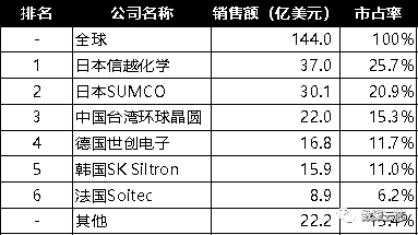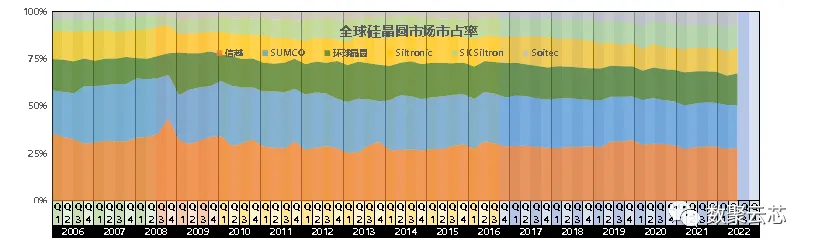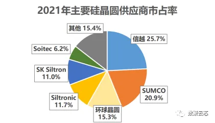 纵观全球晶圆市场,Soitec则作为第六大供应商,承包了约6%的市场份额。截止2021年,主要晶圆供应商市占率如下图所示。