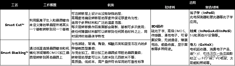 与此同时,Smart Cut™(智能剥离技术)与Smart Stacking™(智能堆叠技术)作为Soitec的两大核心工艺,具体信息如下表所示。